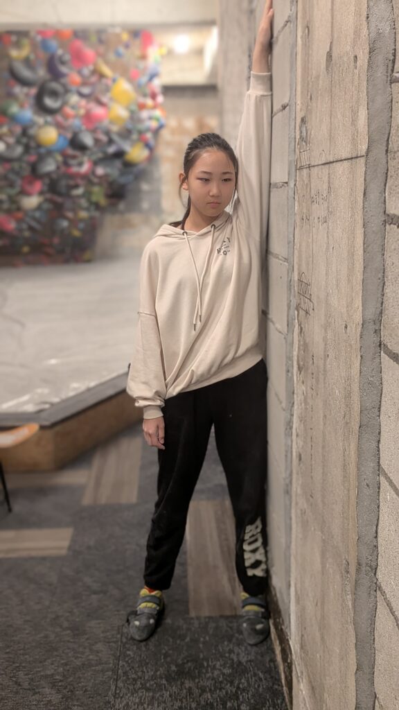 この状態で、体の中心線上にあるホールド(壁についている突起物)を持つと、**「3点支持」**と呼ばれる、安定した体勢が作れます。